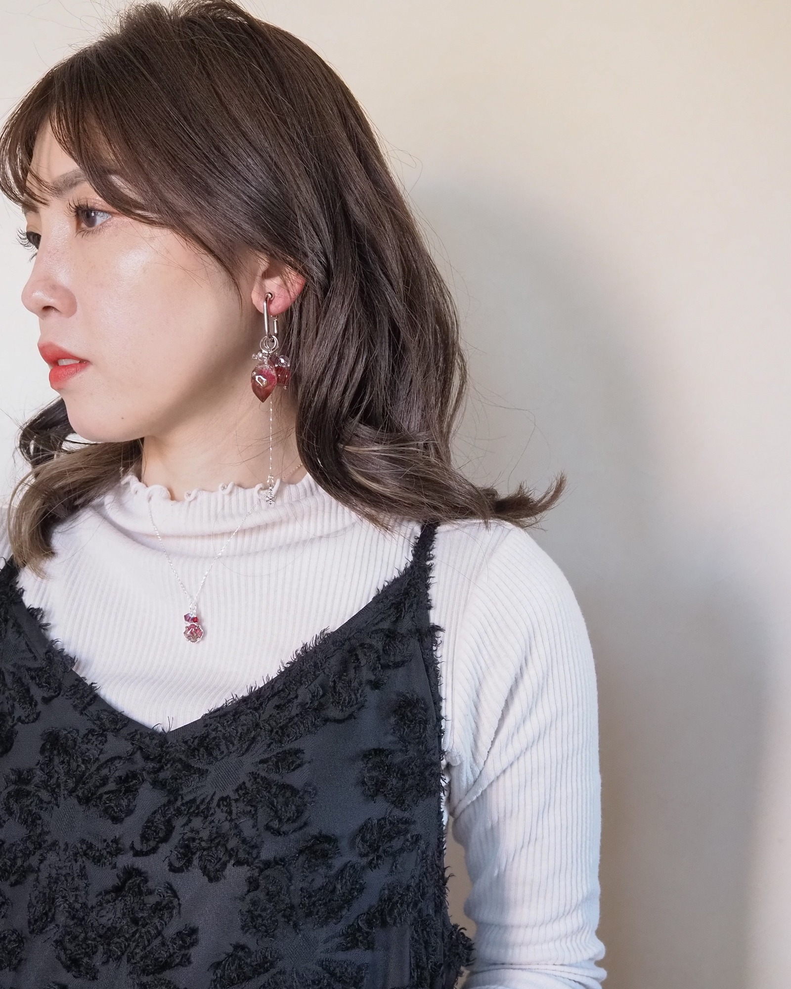 カジュアルなブラックワンピコーデに、赤のアクセントをプラスしたコーデ。赤色を引き立てるために金具のカラーもSilverをチョイス。ネックレスも同コレクションを合わせて統一感を。アクセサリーを主役にしたかったのでリップはマットで仕上げて、艶はアクセサリーだけにしました。