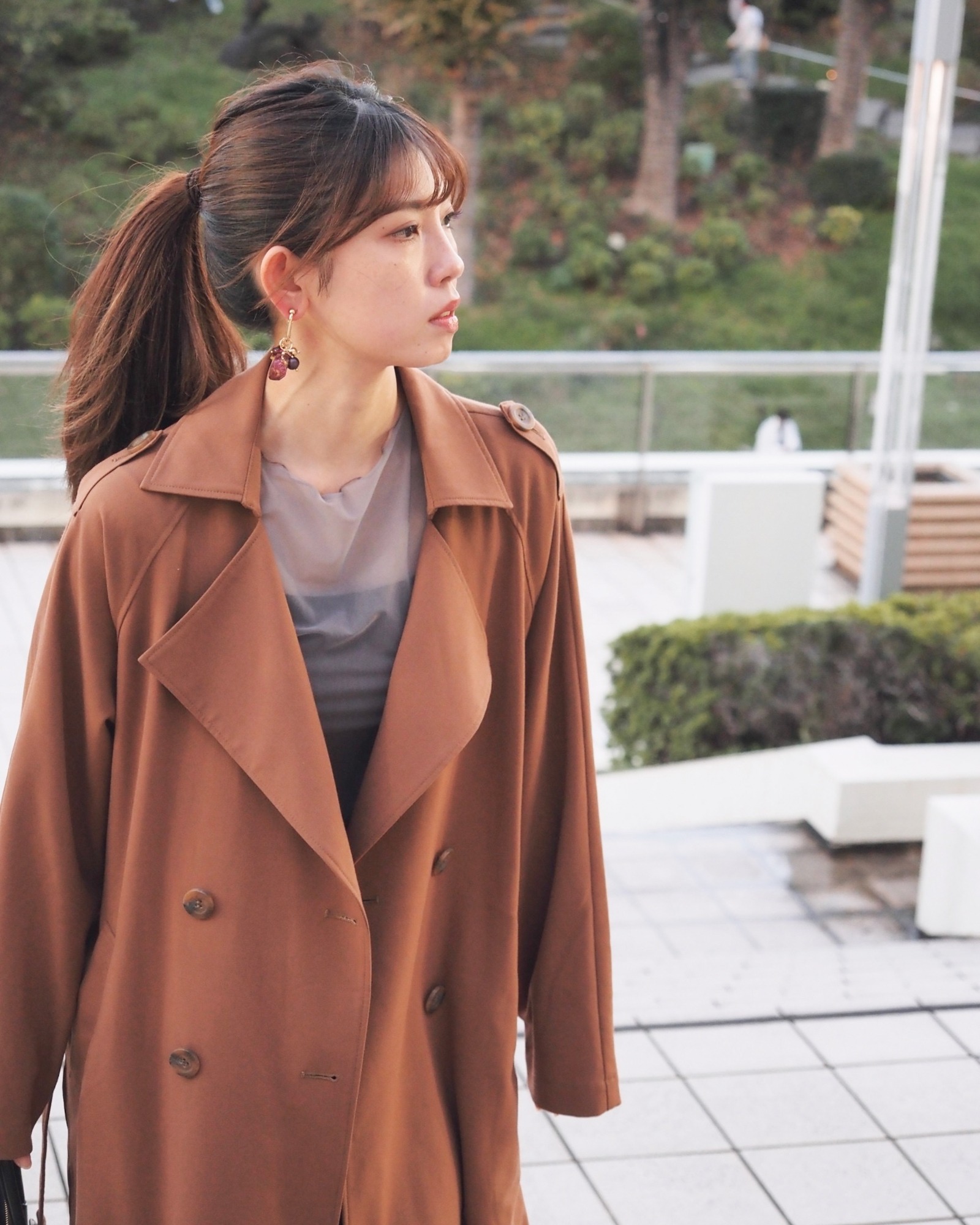 キャメルトレンチのアクセントにレッドブラウンのAsobi.を合わせたコーデ。どうしてもトレンチの印象が強くなるのと、シアートップスに目線が行きがちになるので耳元に赤をプラスし、視線を上に誘導。顔周りがパッと華やかになるので、柔らかく明るい雰囲気に✨