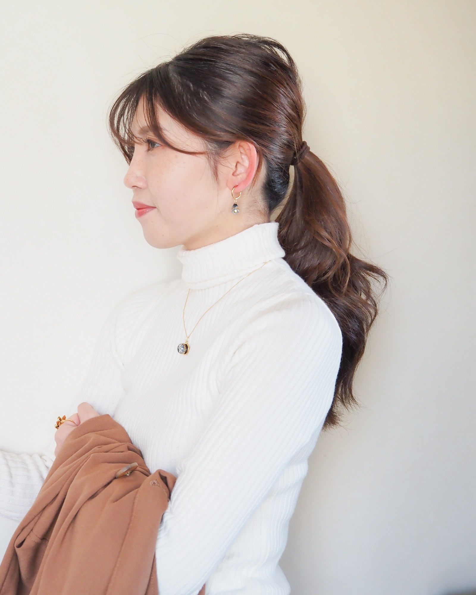 ベーシックなオフホワイトカラーのタートルネックニットを気回した、カラーアクセサリーを楽しむコーデを紹介します!