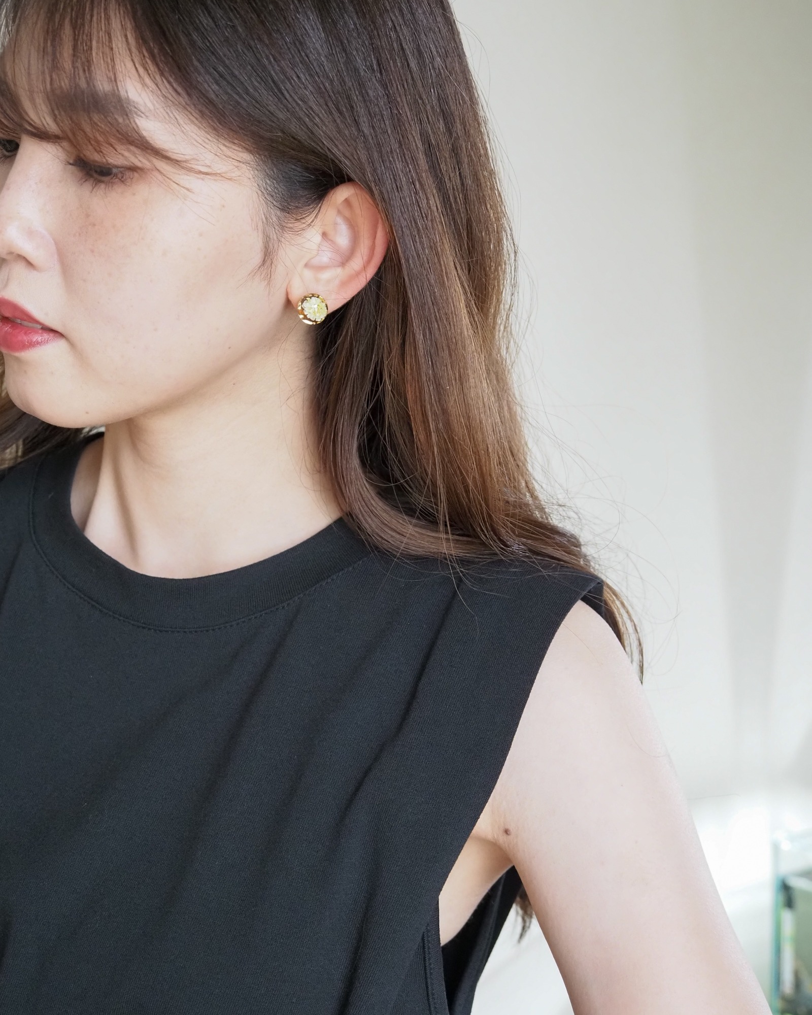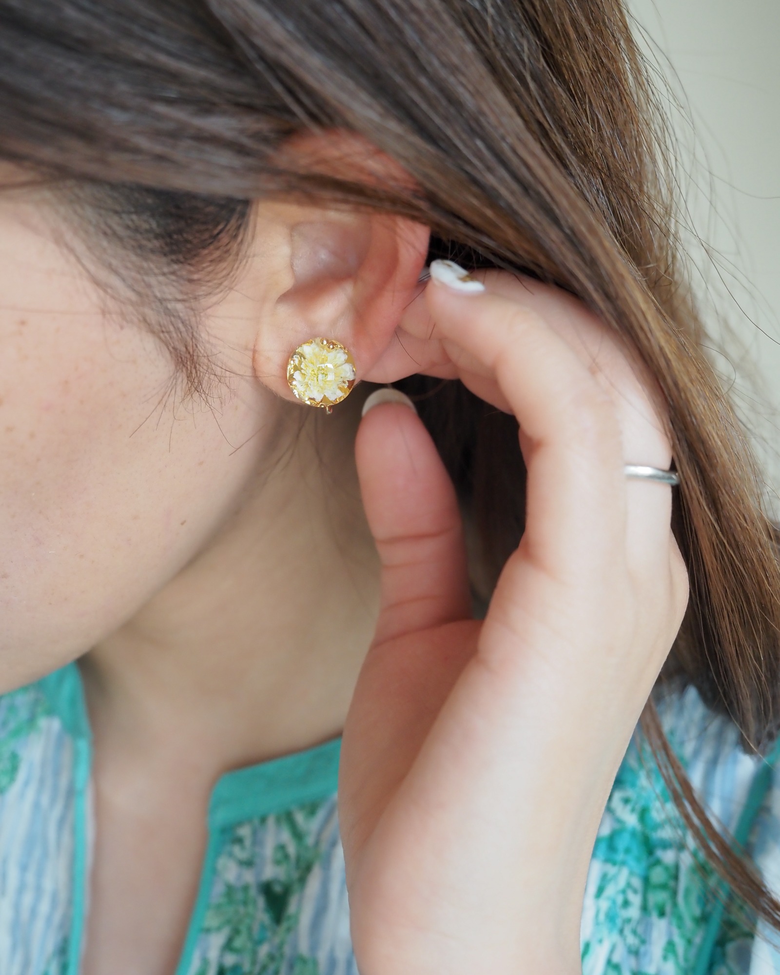 綺麗なイエローのお花に、周りは煌めくGoldのパーツたち。パッと顔まわりを華やかにしてくれるこのカラーは、夏に一番可愛い仕上がりになりました。シンプルなコーデのアクセントにおすすめ。