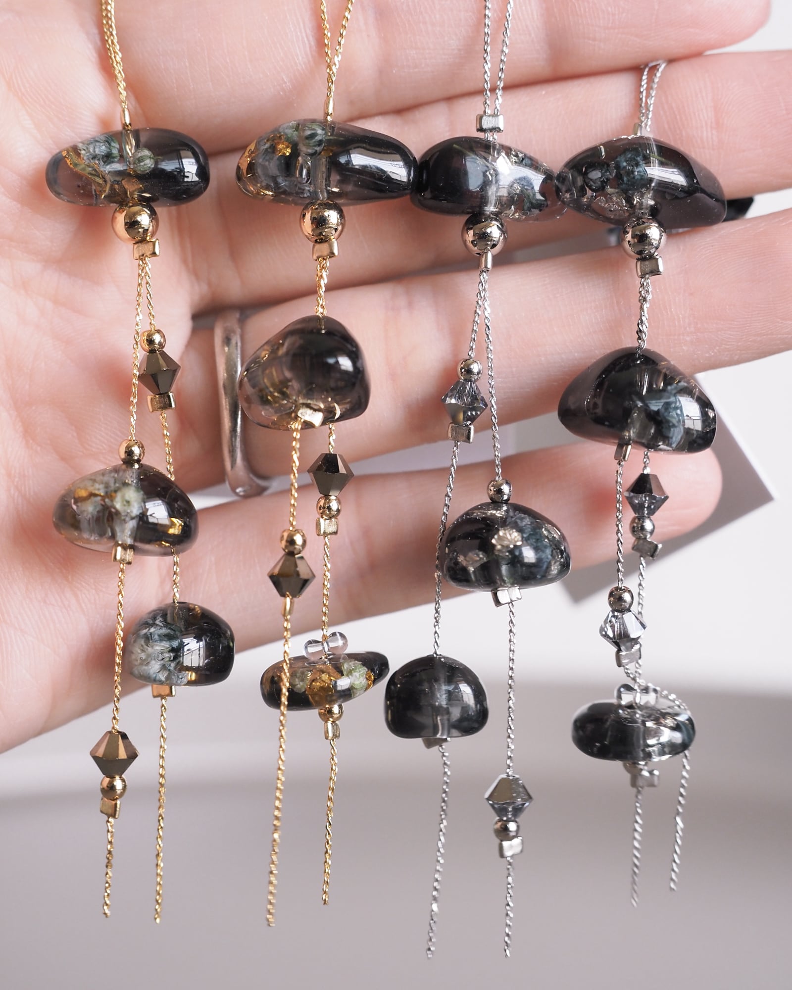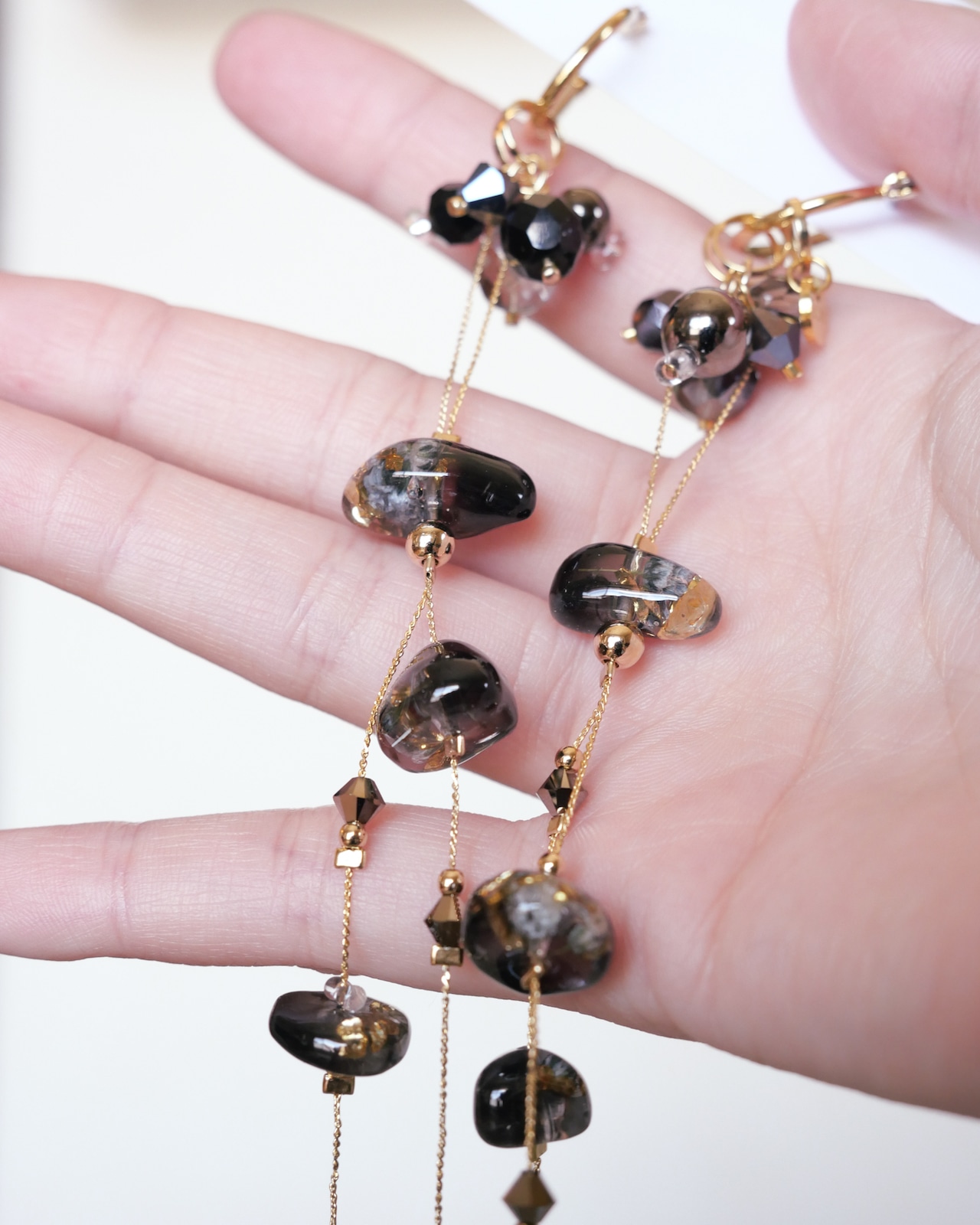 水面に揺れる月の光を映したような、やわらかく揺れるビーズの輝き。繊細なチェーンにそっと添えた光の粒は、歩くたびにふわりと揺れて、何気ない日常の一瞬にも、静かな特別感を運んでくれます。少し背筋を伸ばしたい日、いつもより丁寧に過ごしたいひとときに。