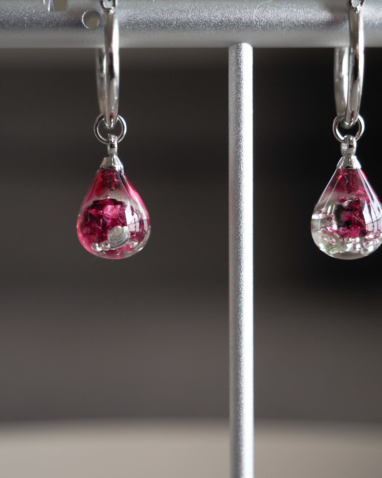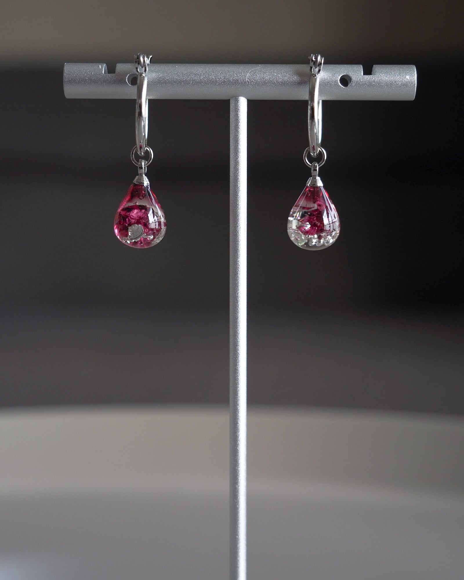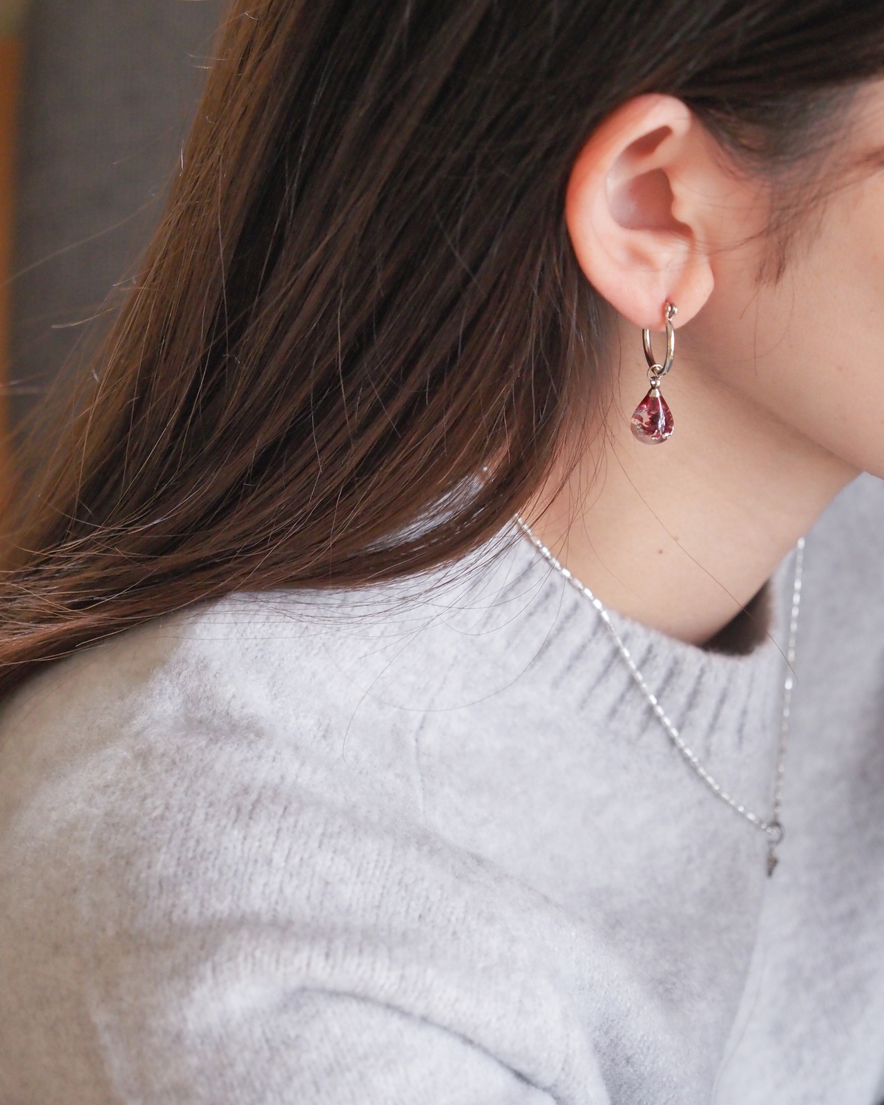 透明感のあるレジンに繊細な彩りを宿したデザインは、耳元に凛とした美しさを添えてくれます。軽やかな着け心地で、日常使いはもちろん、シックな装いにも溶け込みます。