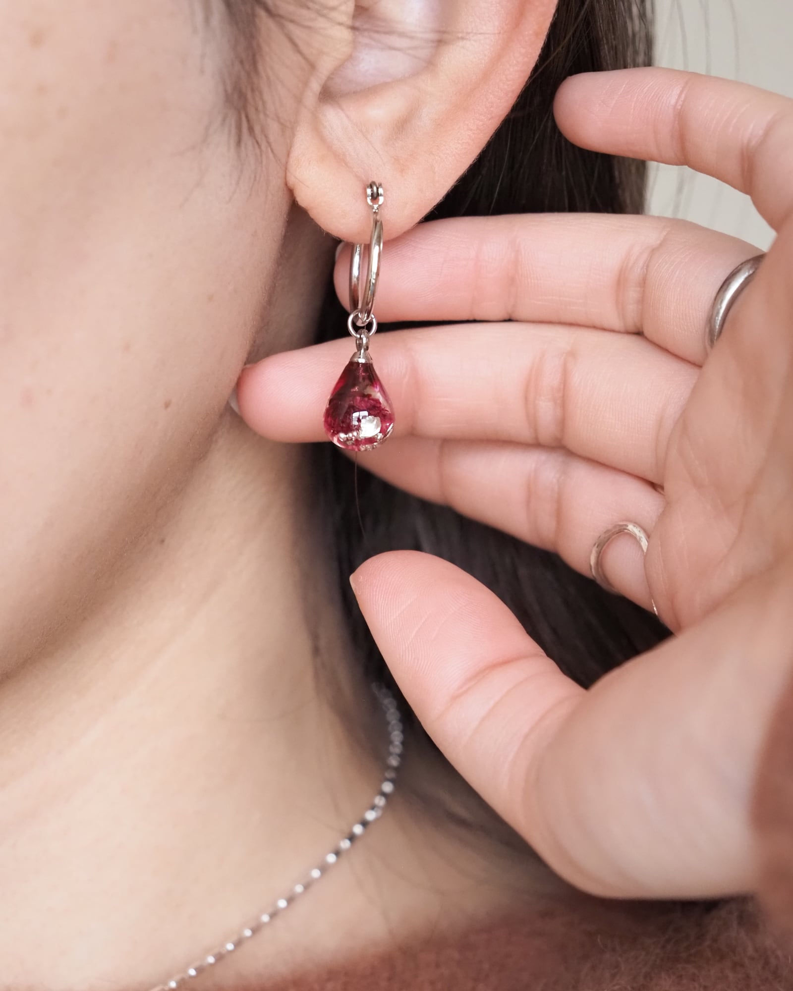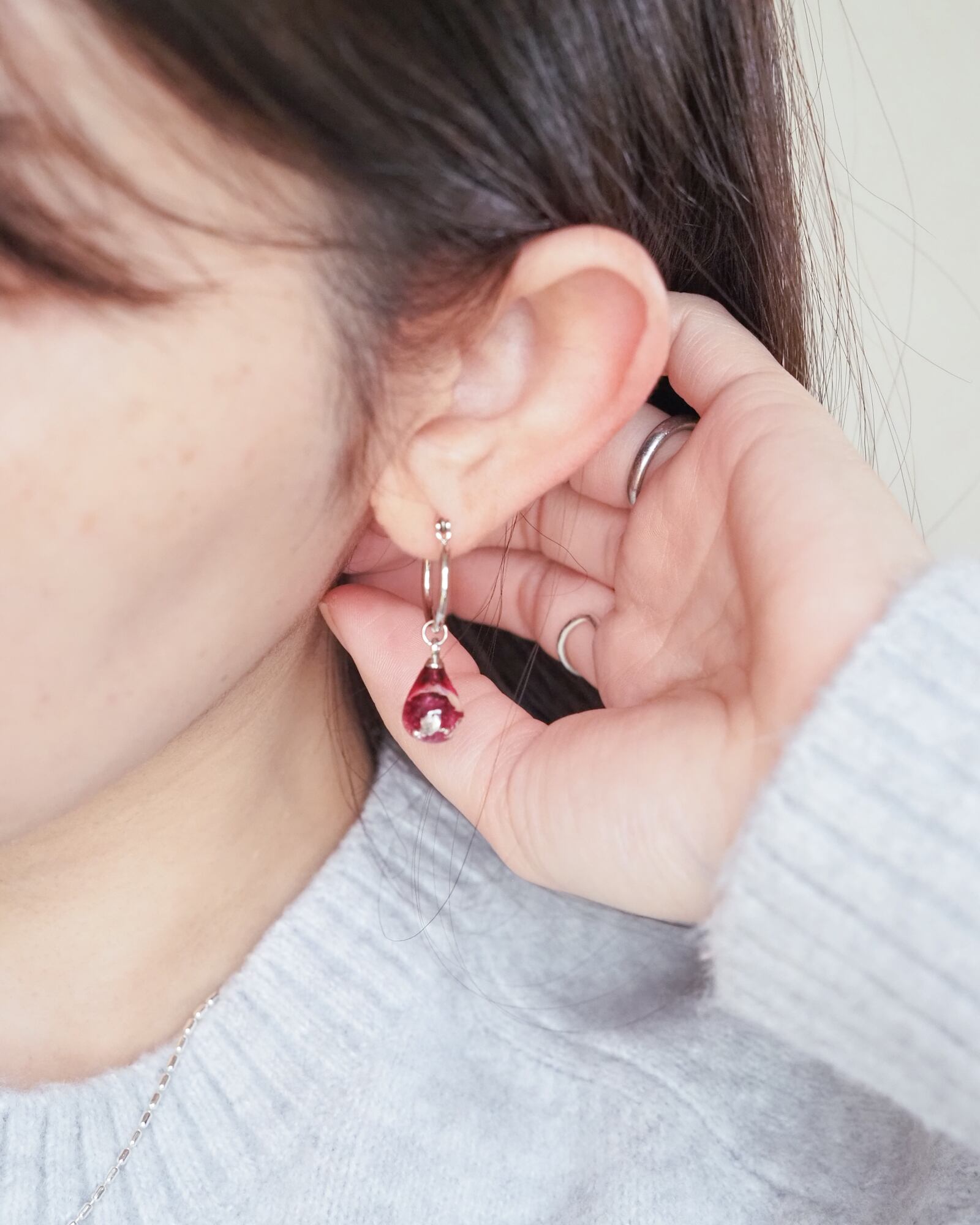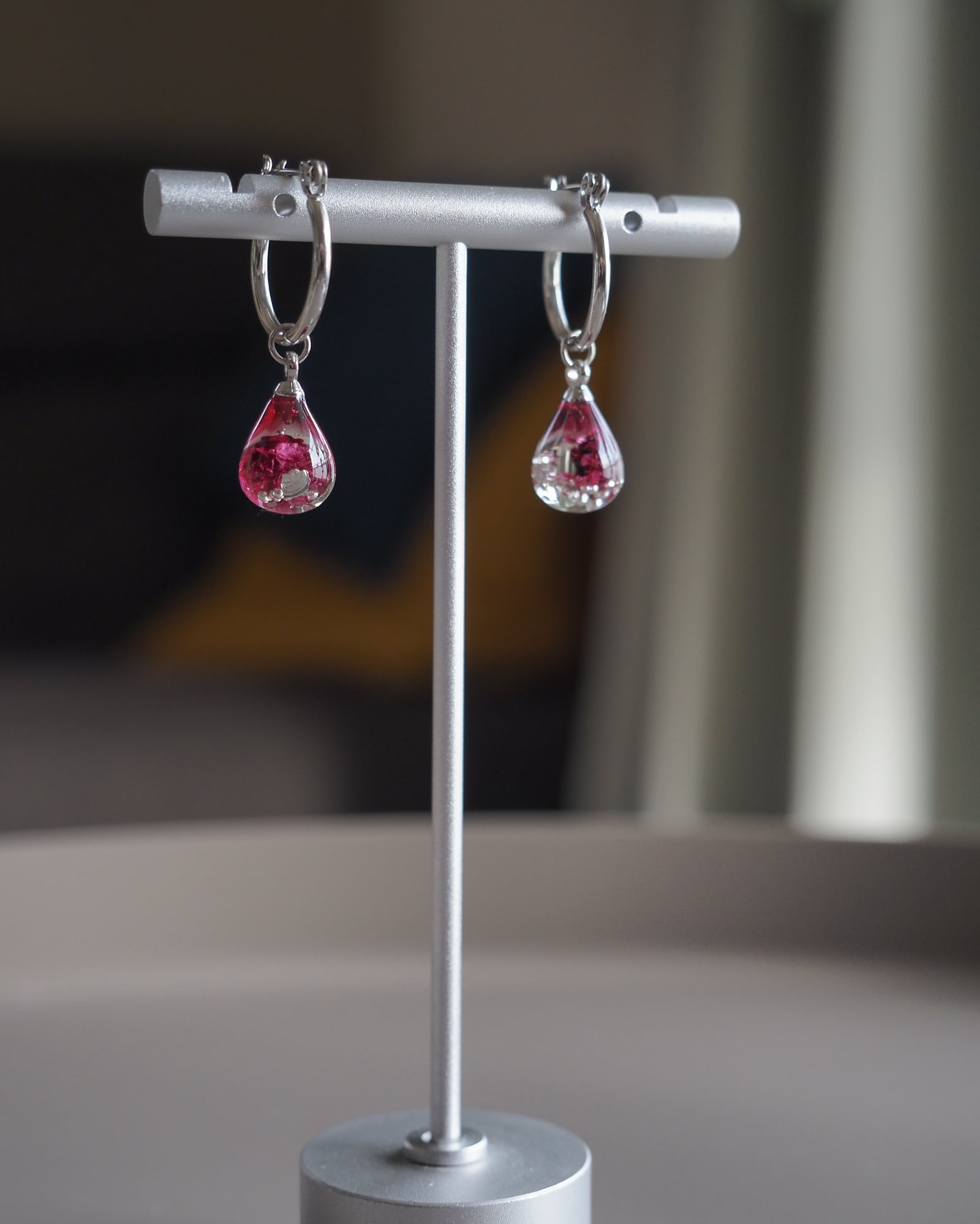 透明感のあるレジンに繊細な彩りを宿したデザインは、耳元に凛とした美しさを添えてくれます。軽やかな着け心地で、日常使いはもちろん、シックな装いにも溶け込みます。