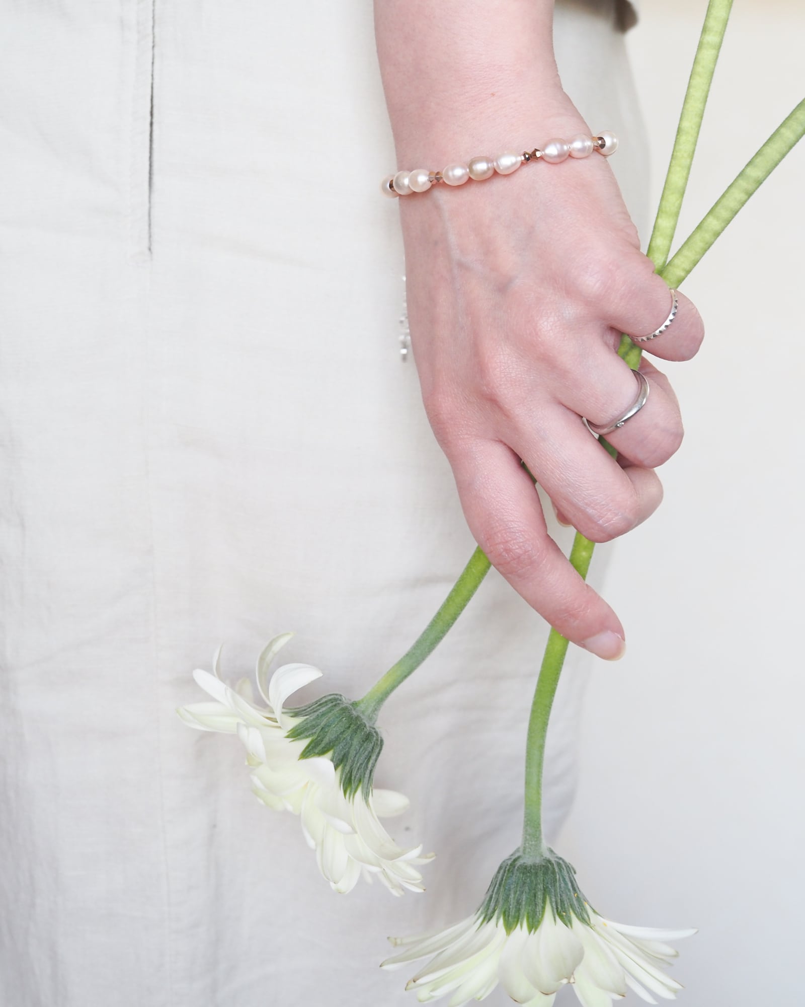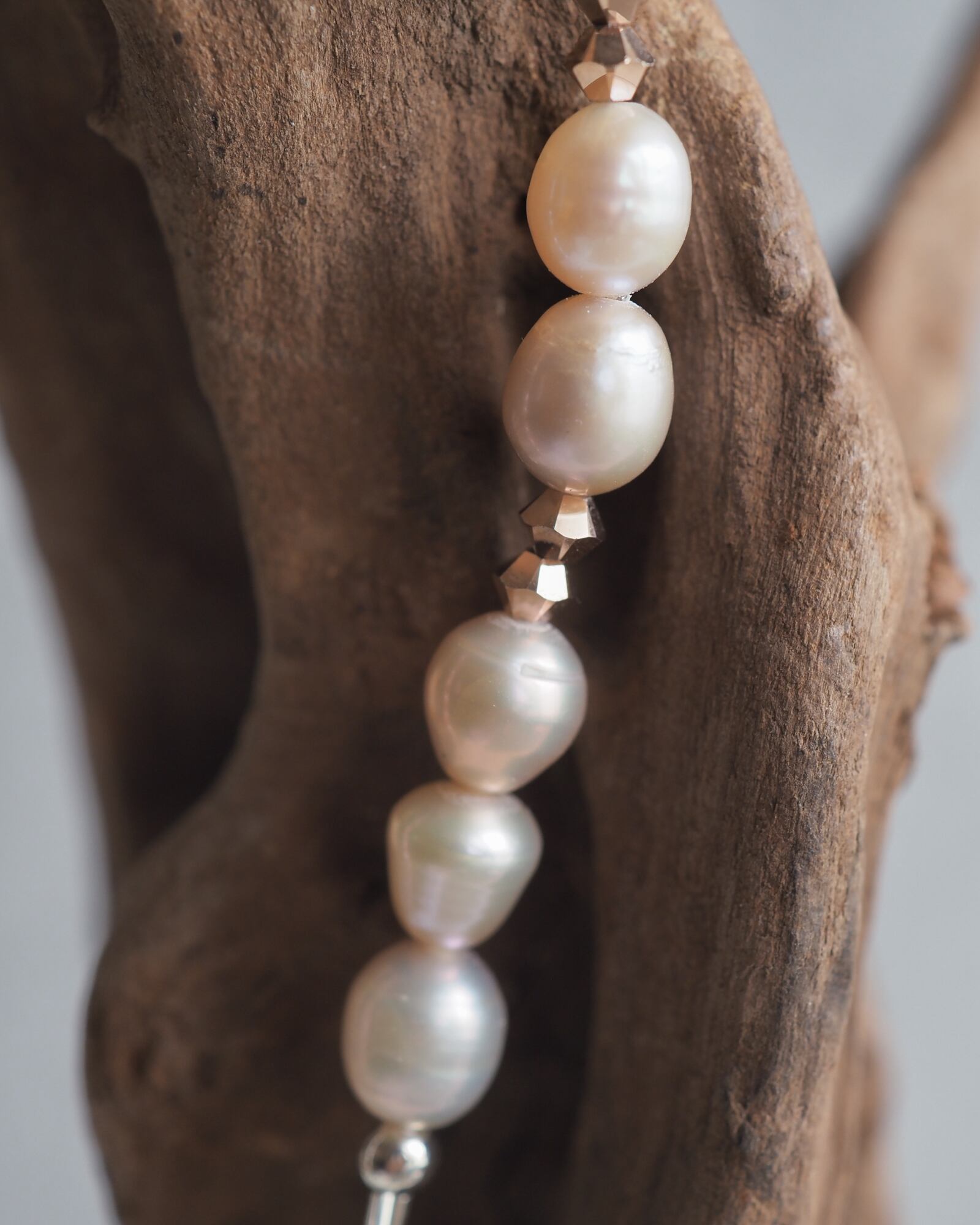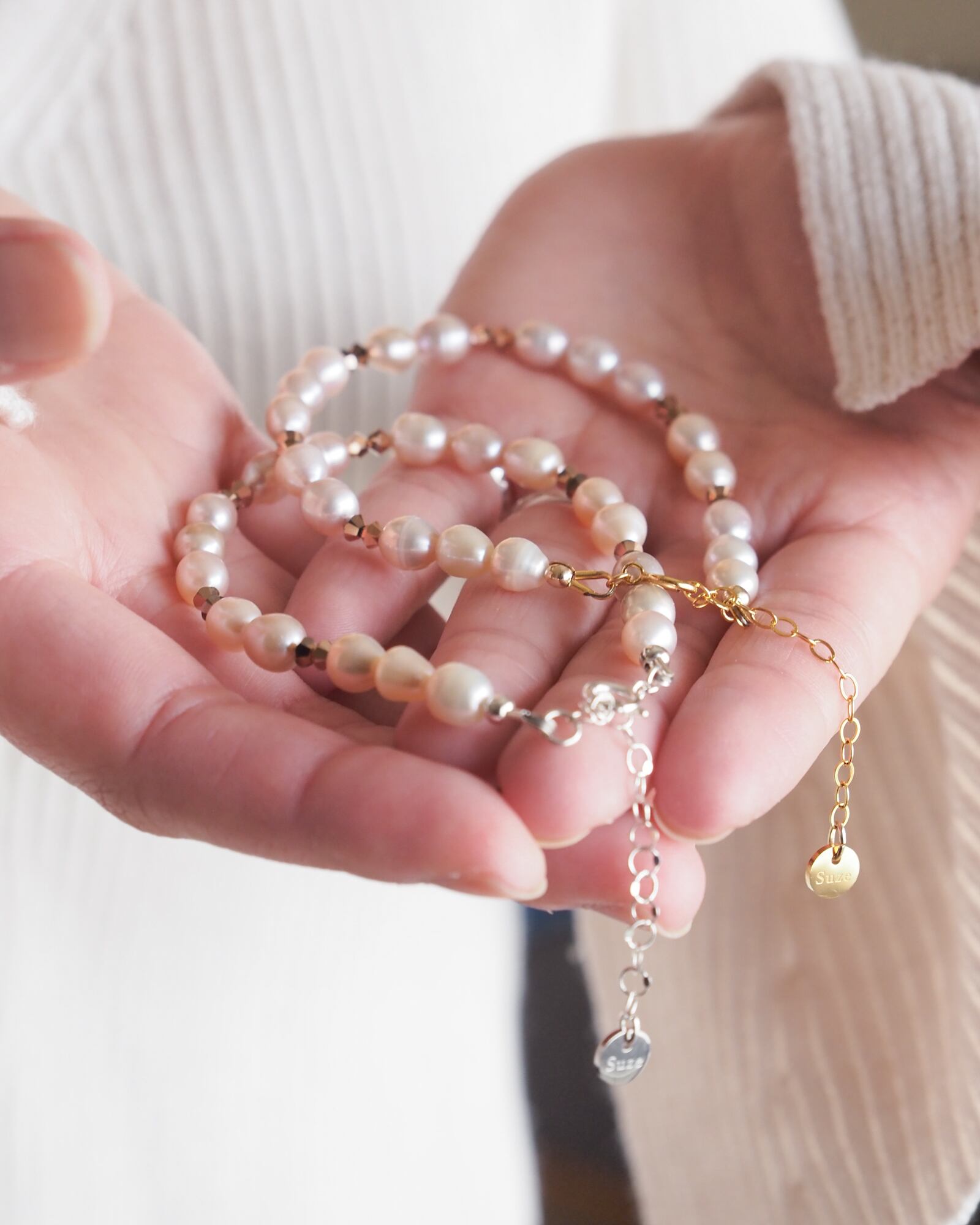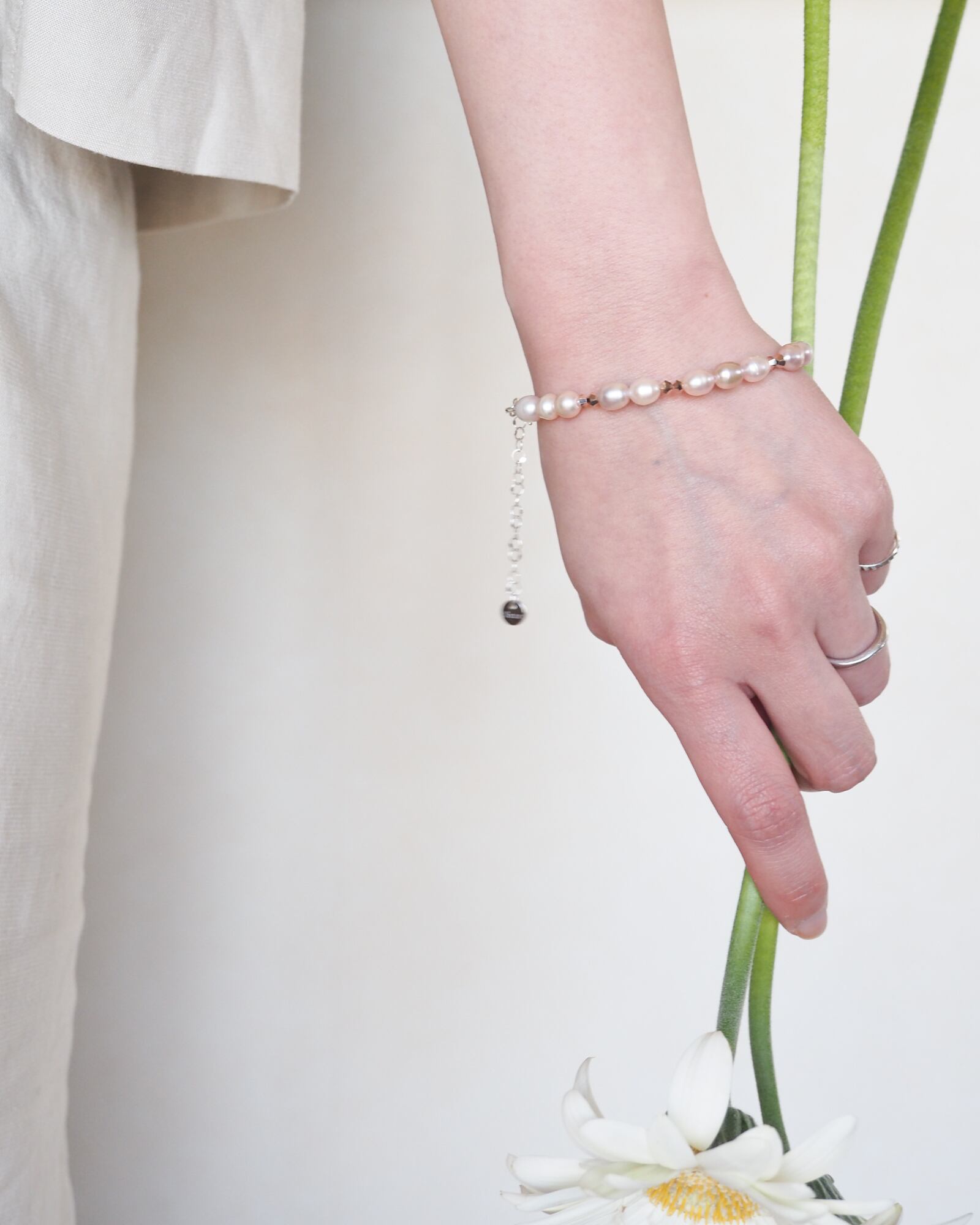東雲のやわらかな光を映した、淡水パールのブレスレットです。