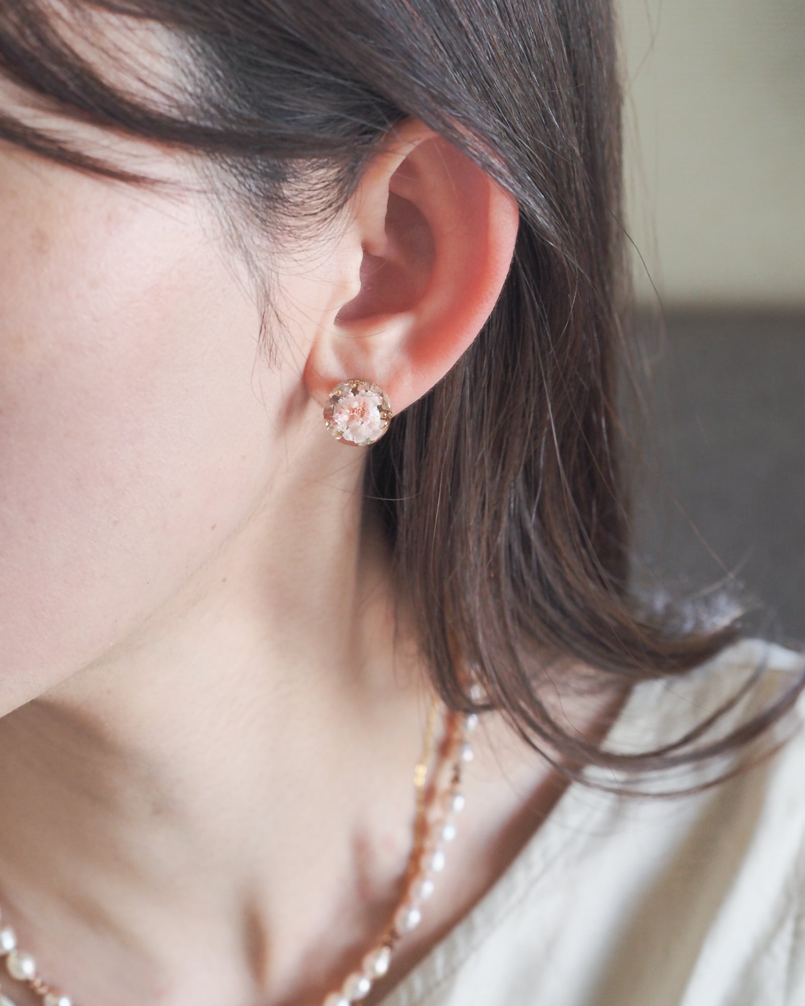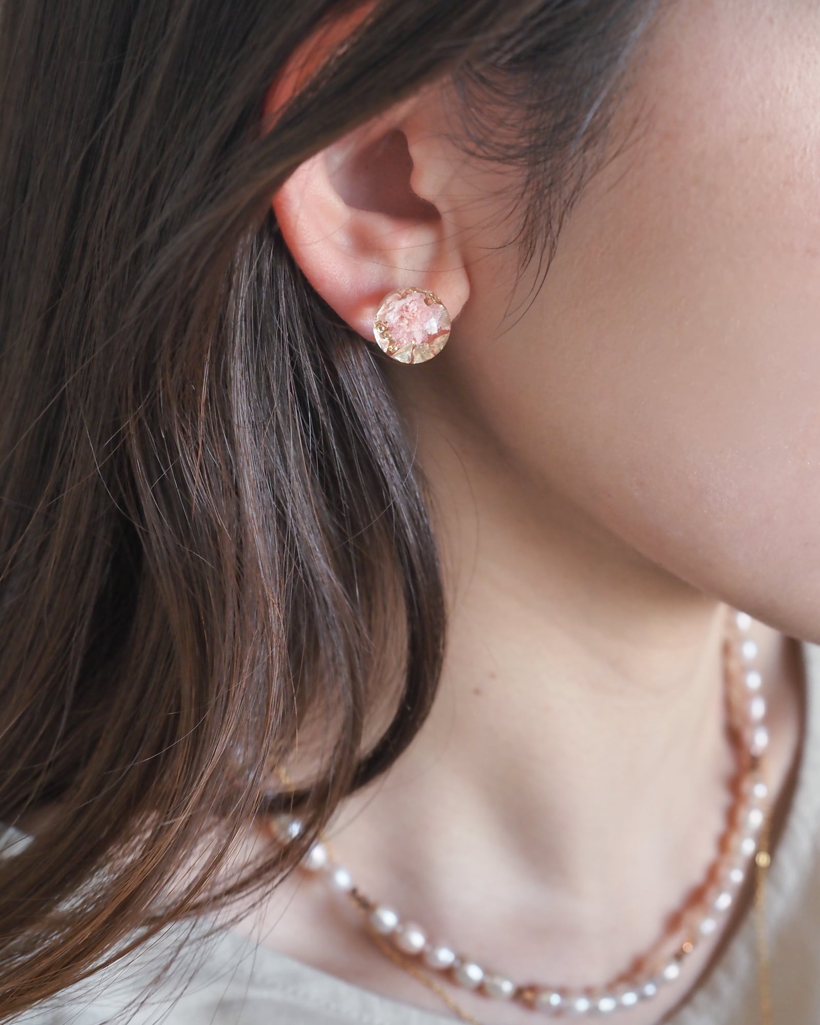 普段使いにも、お出かけにも、ささやかなときめきを添えてくれます。キャッチ部分まで丸く仕上げ、後ろ姿まで美しく見えるよう細部にこだわりました。